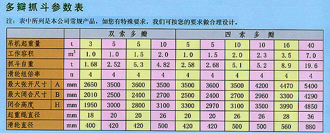雙案多瓣抓斗(即荷花抓斗),吃料較深,可抓取顆粒較大的散貨,通常為廢鋼、煤炭、礦石等。